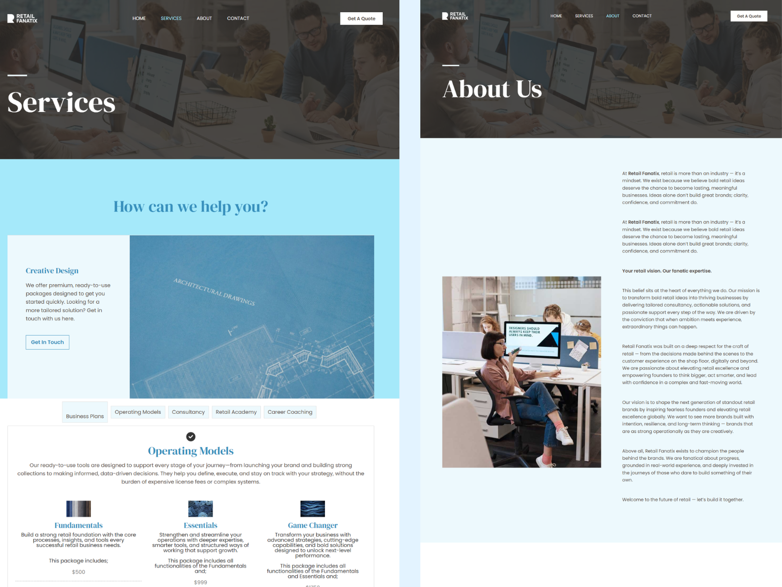 Retail Fanatix is a retail consultancy and education platform helping entrepreneurs, retail professionals, and growing brands transform ideas into successful businesses. The goal of this project was to create a modern, strategic, and authority driven website that reflects industry expertise while driving inquiries for consultancy, academy programs, and career coaching.