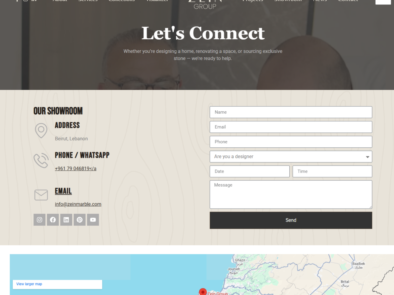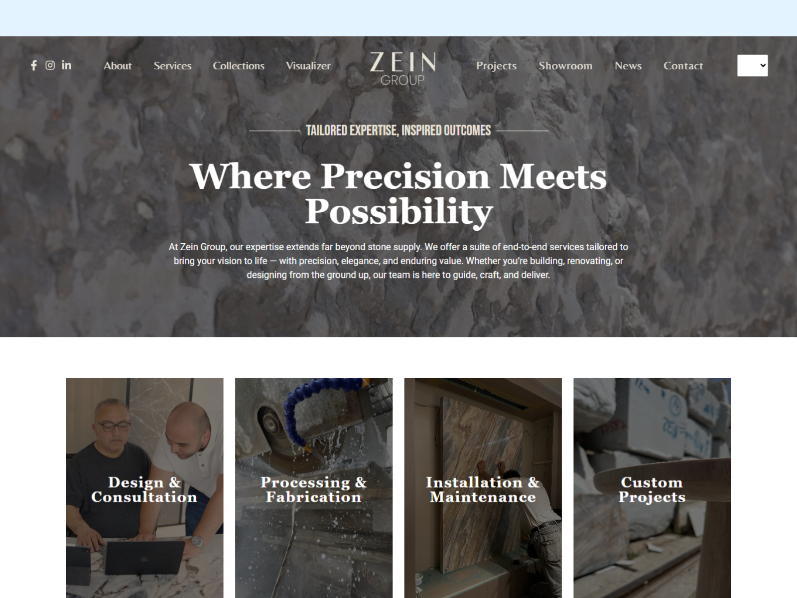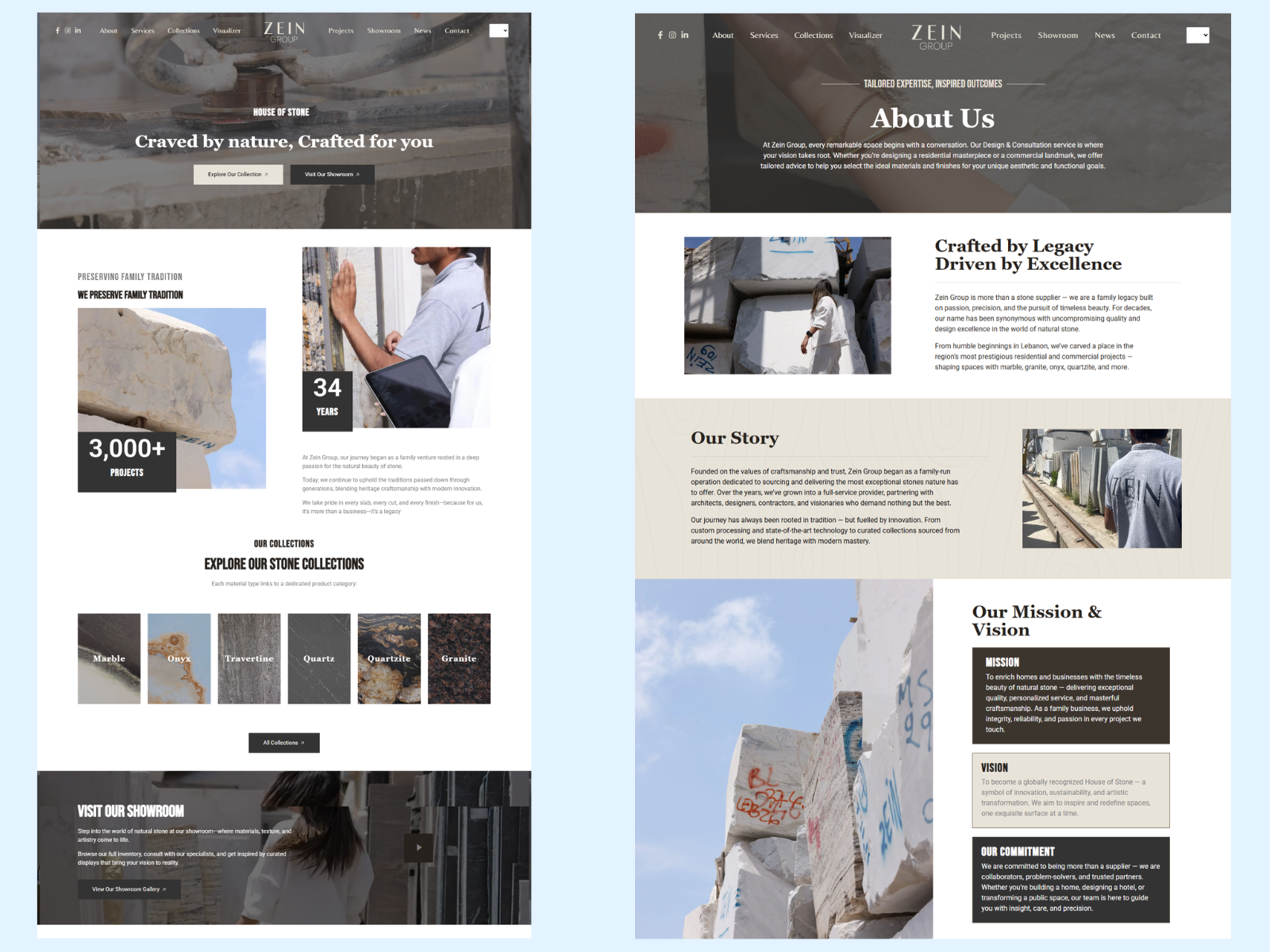 Zein Group is a second generation family business specializing in premium natural stone materials including marble, onyx, travertine, quartz, quartzite, and granite. With over 33 years of experience and 2,800+ completed projects, the objective was to create a refined, heritage driven website that reflects craftsmanship, legacy, and architectural excellence.